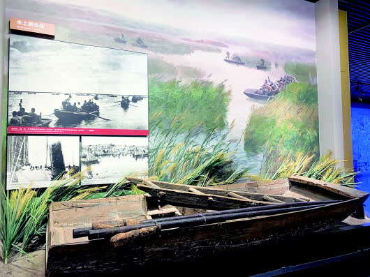 跟随任京培的步伐,记者看到了纪念馆中陈列的一艘长约三四米的木船,上面被日军射击的累累弹痕印证着历史。在船上,还有两把近3米的大抬杠枪。任京培说,这是一种当地猎人发明的武器,枪筒又长又粗,不但打得远,而且火力足威力大。