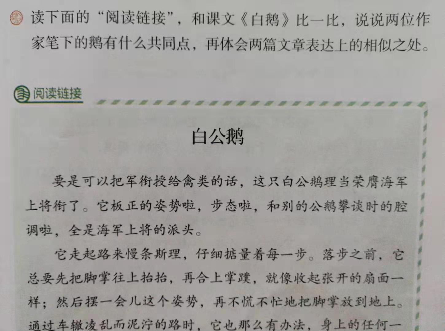 《白鹅》是著名散文家,漫画大师丰子恺写的。全文语言活泼,诙谐,有情趣,字里行间透露出作者对白鹅的爱怜和欣赏。学生也非常喜欢阅读这样的文字。