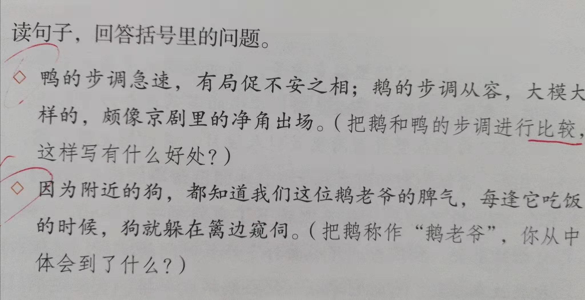 其次,在描写方法上,两篇文章都注意拟人手法的运用,作者把鹅当成自己的朋友家人,赋予了它们人的情感,鹅的形象生动鲜活,读起来非常亲切可爱。