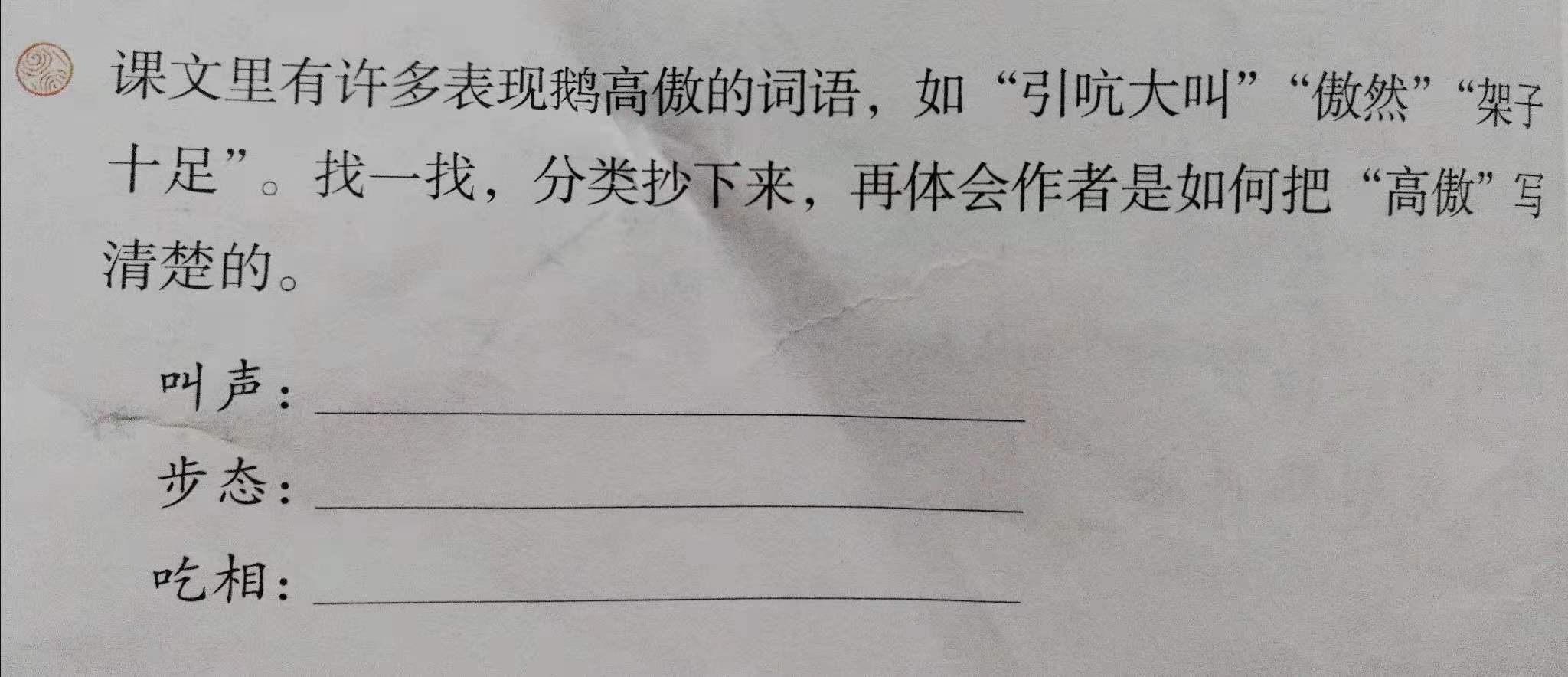 学生按文章清晰的思路,根据课堂学习的理解感悟,摘录积累相关的词语,体会作者细致入微的观察,富有趣味的笔调把白鹅的高傲表达得淋漓尽致。
