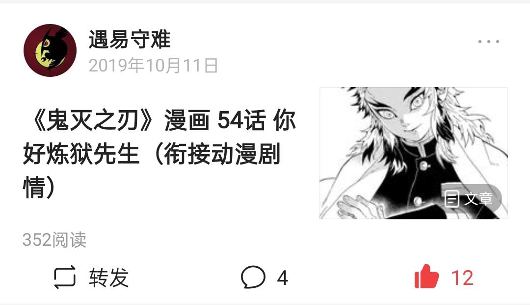 《鬼灭之刃》这部作品,也是我做头条“动漫领域创作者”的契机。起初我的愿望是想让更多的人去看的这部作品,让动画党可以了解后续发生的故事,让不能花钱看的学生党有个看漫画的地方……所以我在2019年10月11号发了第一个漫画:54话,你好炼狱先生。
