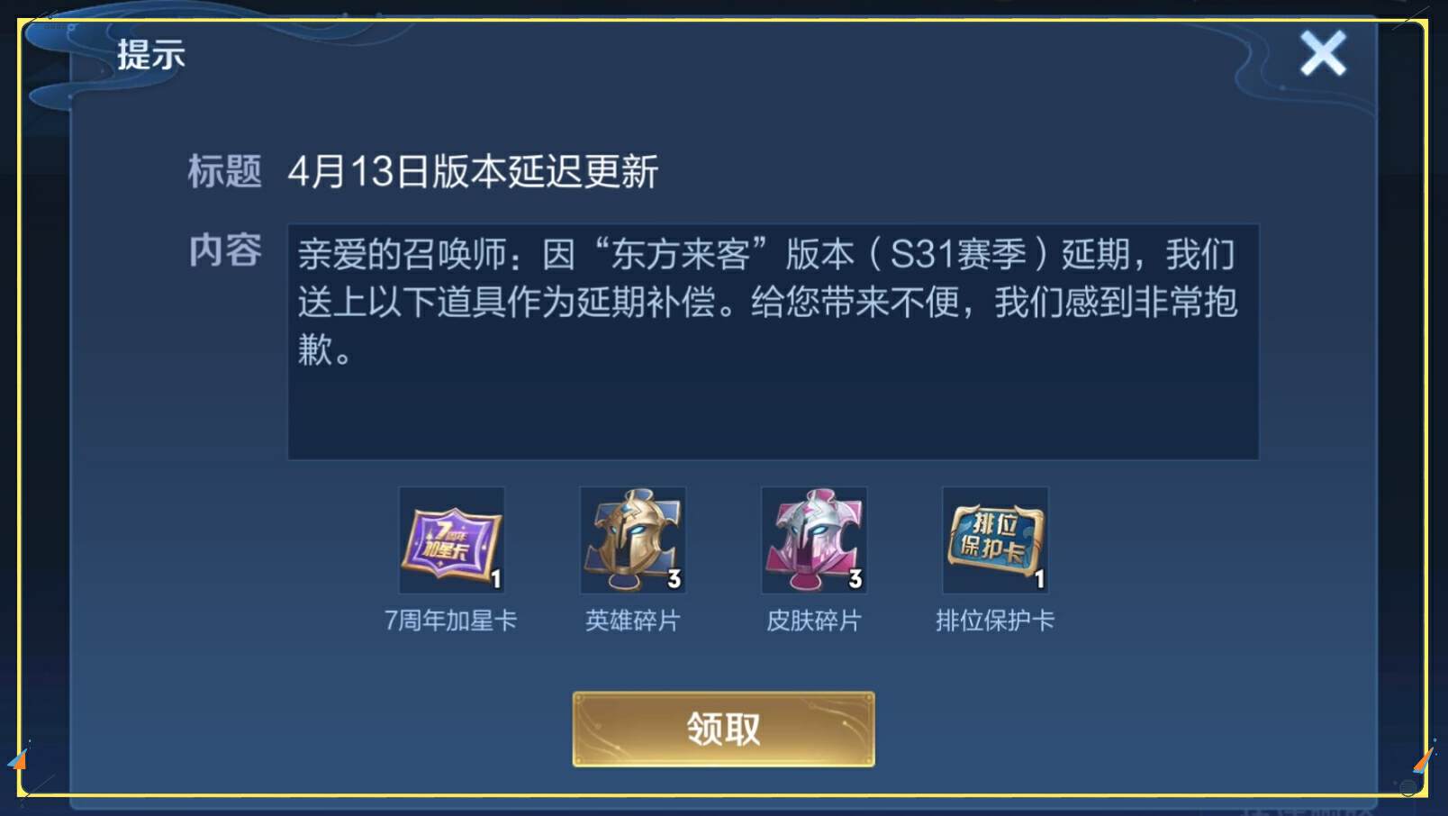 因为新赛季延期更新,所以官方给我们补发了奖励,现在登录游戏基本上就可以领取了。