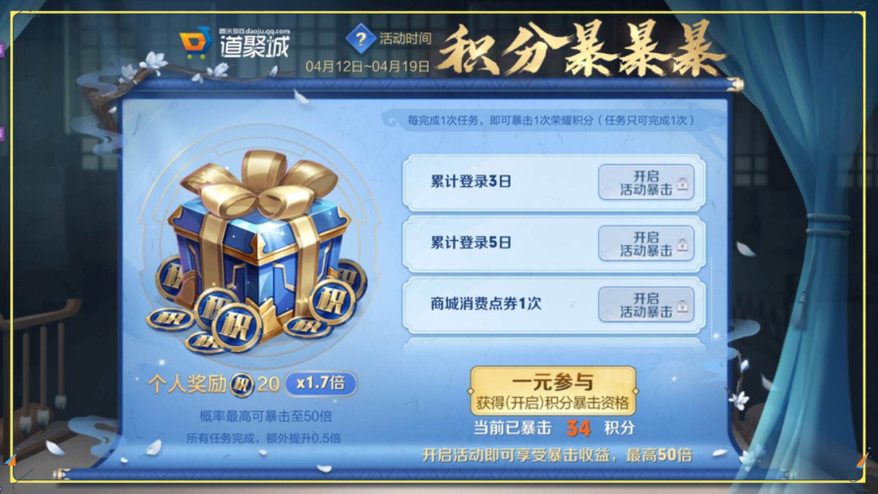 活动规则最高可以获得50倍,也就是可以领取1000点荣耀积分,而