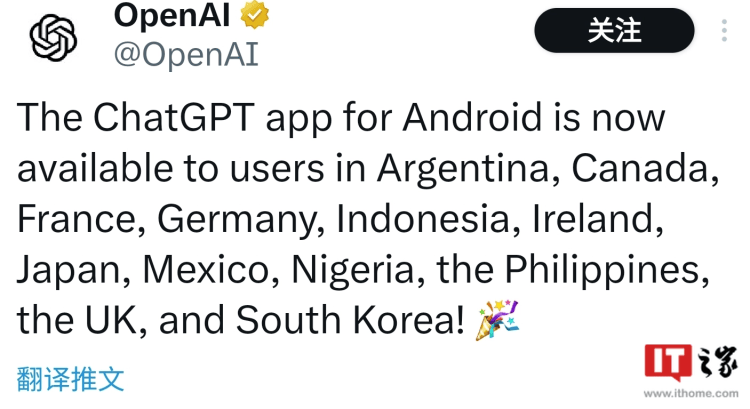 OpenAI 官方宣布,安卓版 ChatGPT 应用现已面向阿根廷、加拿大、法国、德国、印度尼西亚、爱尔兰、日本、墨西哥、尼日利亚、菲律宾、英国和韩国用户推出。