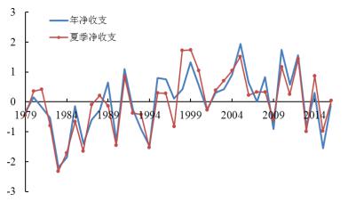 1979-2016年青藏高原地区年和夏季水汽净收支变化(图片来源:中国气象局成都高原气象研究所)