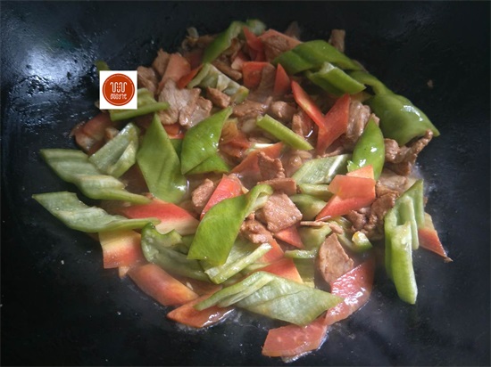 8、放入尖椒,胡萝卜翻炒片刻。