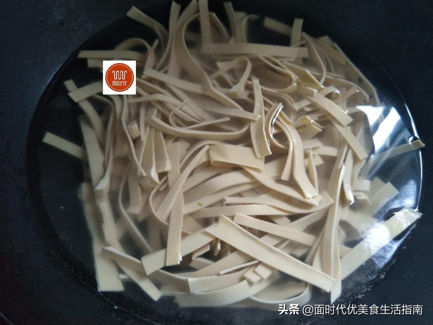 3、锅里水烧开,下入豆皮焯烫30秒捞出。