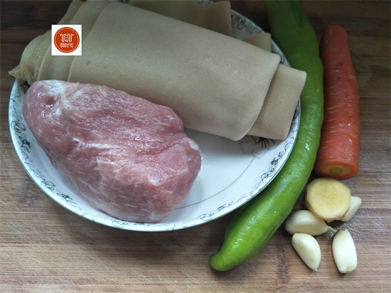 食材:豆腐皮1张、尖椒1根、胡萝卜1根、瘦肉1块、姜1片、蒜1粒、盐半勺、水淀粉适量、料酒少量、酱油适量。
