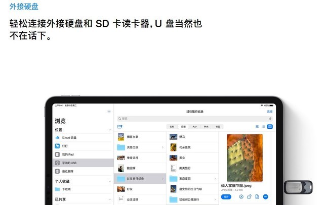 2、iPad OS的更新带来了外接硬盘支持,这让iPad可以连接外接硬盘和SD卡读卡器,U盘当然也可以。购买一个转接器或者带Lightning接口的U盘,就可以通过读取U盘来浏览文件,可以减少存储文件压力。