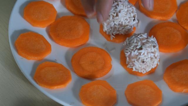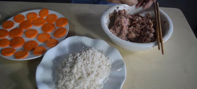 第二步:将胡萝卜洗净后切成薄片,然后用手抓起肉馅,抓出适量大小的肉丸子,然后裹上一层糯米,接着将做好的糯米丸子放到胡萝卜上面,重复操作,直到把所有的糯米肉丸子做好!
