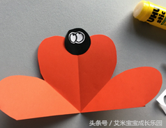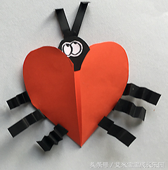 制作步骤5.把红色心形翅膀折叠起来粘贴好,并用黑色卡纸做6只脚,粘到心形边缘。