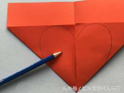 制作步骤1.先将红色卡纸如下图方法折叠好,用铅笔在上面画好心形图案。