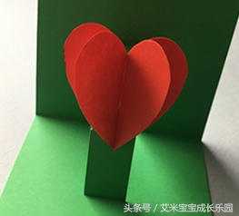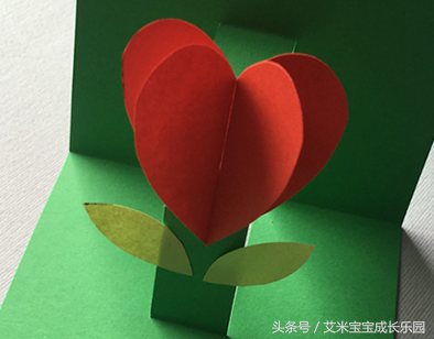 制作步骤4.再剪2片叶子分别粘贴到花茎两侧做为点缀,立体爱心花朵就完成啦。