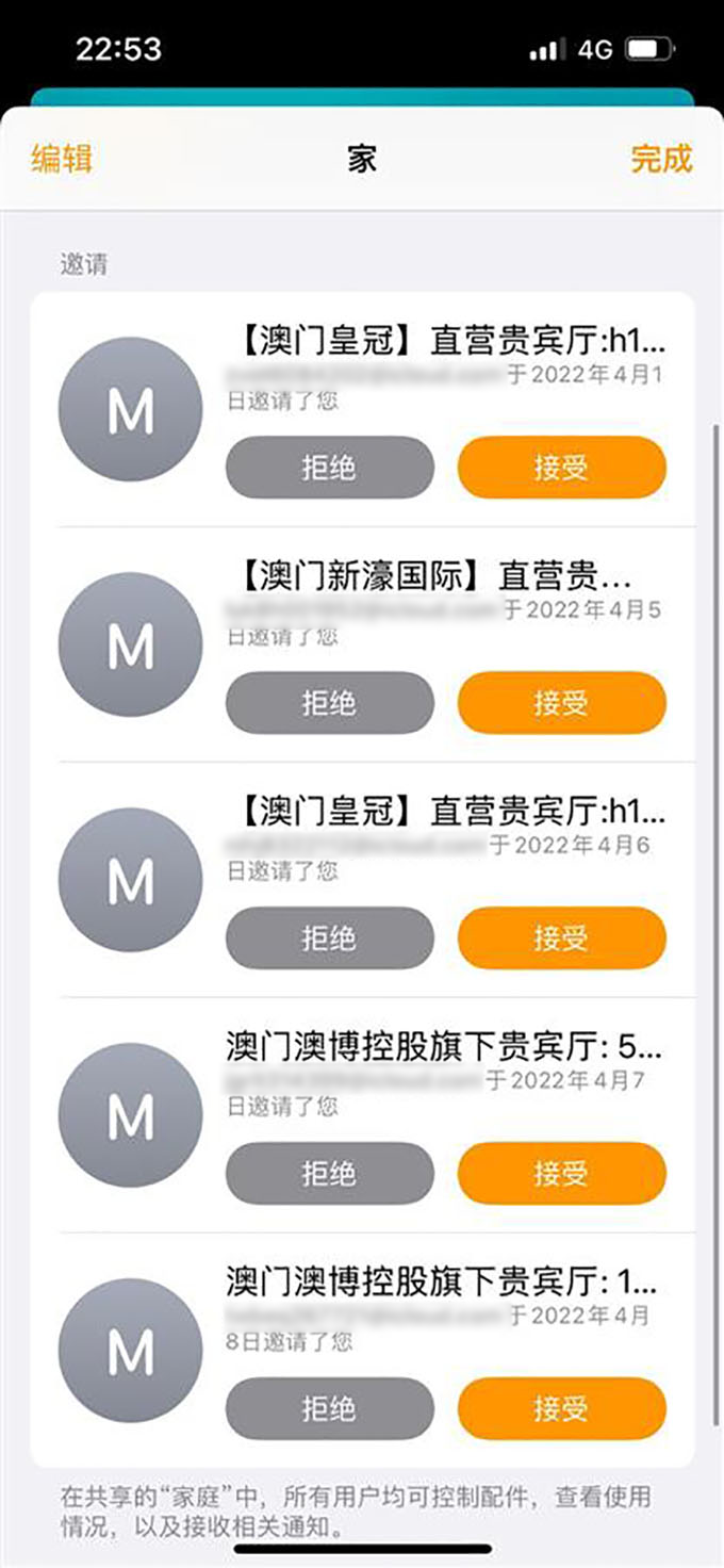 来自武汉的市民胡女士就是其中的一名受害者,自从4月初开始,她的苹果手机自带的“家庭”APP几乎每天都会接收到类似的赌博邀请信息。