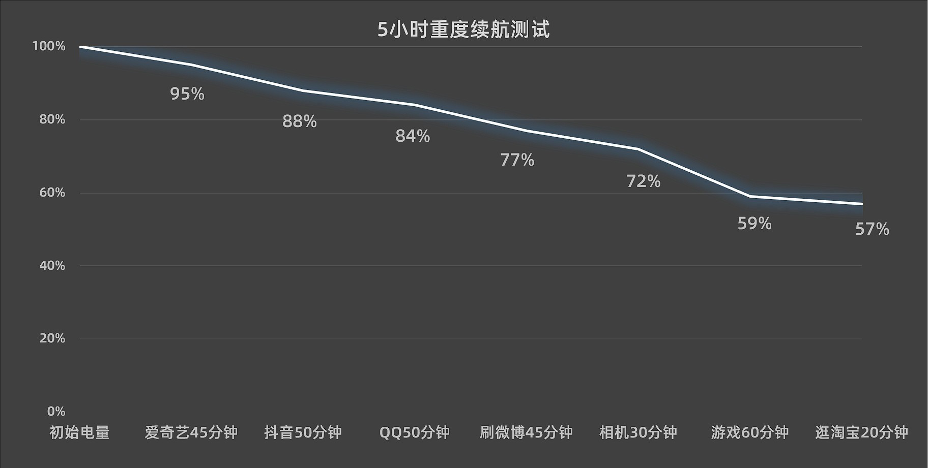 续航方面,我们采用中关村在线5小时重度续航测试模型,对其进行了续航测试。在当前室温环境下,连接办公室Wi-Fi,关闭蓝牙、GPS,屏幕亮度、音量均设为50%。