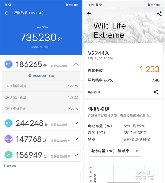 在安兔兔和3D Mark Wild Life Extreme的跑分测试中,vivo S16分别得到73万分和1233分的成绩,在一众骁龙870产品中应该算中上等的水平了。