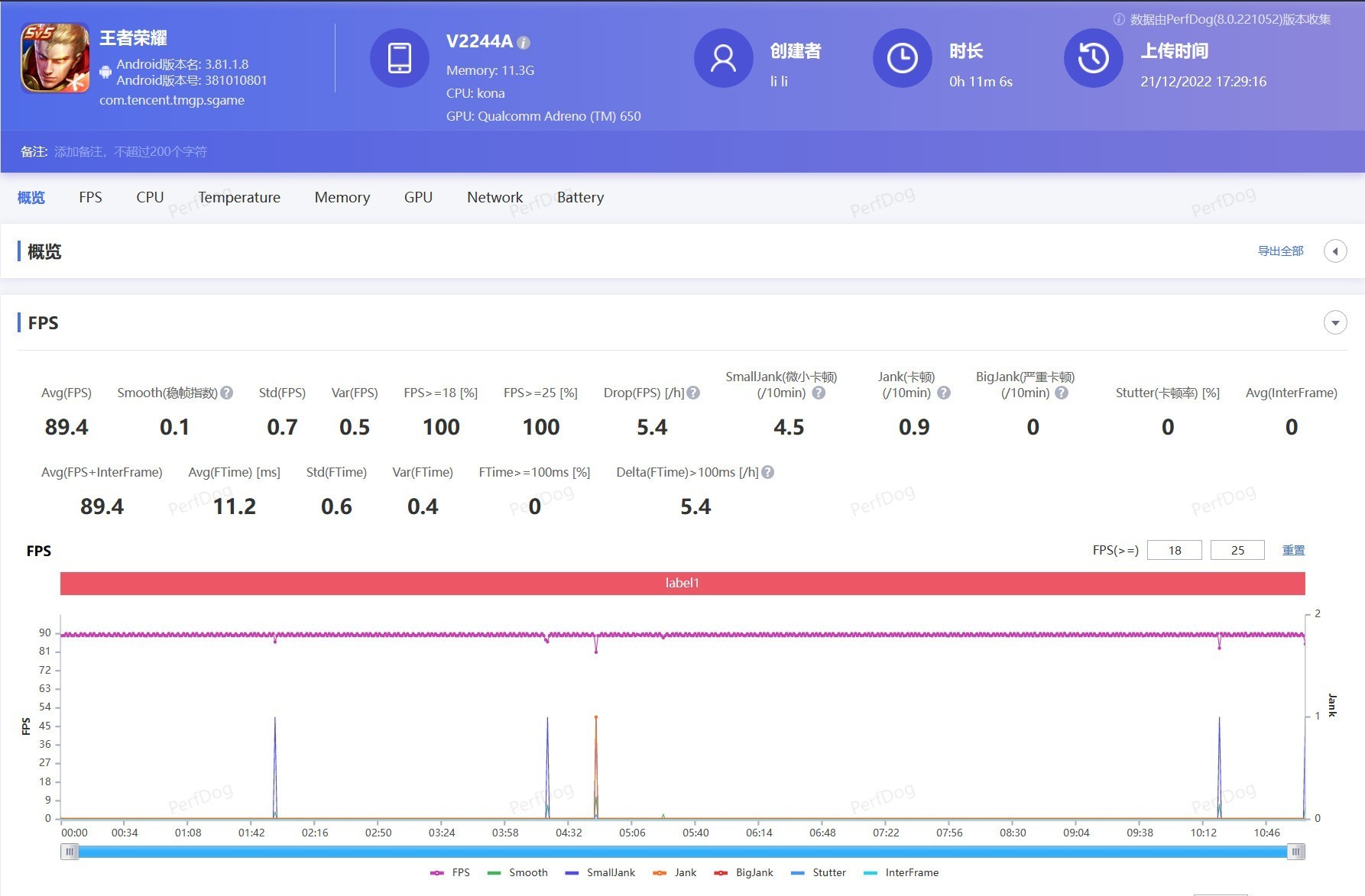 最终vivo S16的平均帧率为89.4帧,帧率曲线相当平稳。虽然说没有120帧模式比较遗憾,但以多年玩《王者荣耀》的经验来说,90帧的流畅体验已经够用了。
