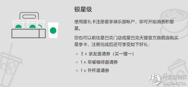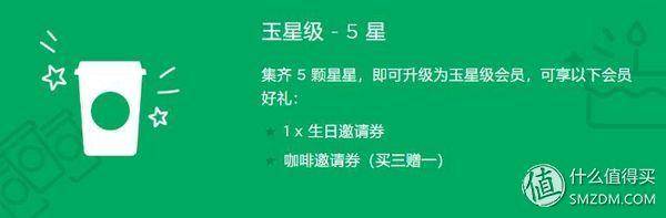 累积5颗星星(累计消费满250元),即可成为玉星级。玉星级开始即可享受两项权益:生日邀请券和咖啡邀请券。生日券很简单,就是每年到你生日月的时候,会赠送一张生日咖啡兑换券,当月有效,价值36元。