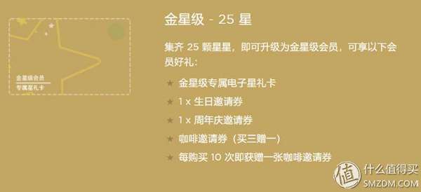 累积满25颗星星(累计消费满1250元),即可升级为金星级,门槛也并不高。金星级的权益就比较多了: