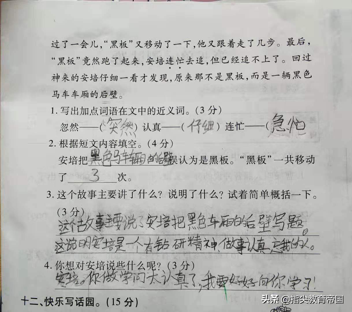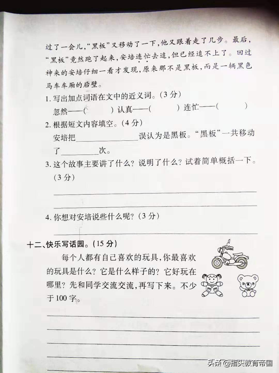 这两天,小徐老师小学部二年级语文终于把第三单元学习完,也复习完了,学校组织了一次考试,拿到考题,小徐老师先看了看前面的基础题,发现这套考题出得真不错,将这一单元的所有重点全检测到了。但是看到后面的阅读理解题,我却被这题的难度惊呆了。