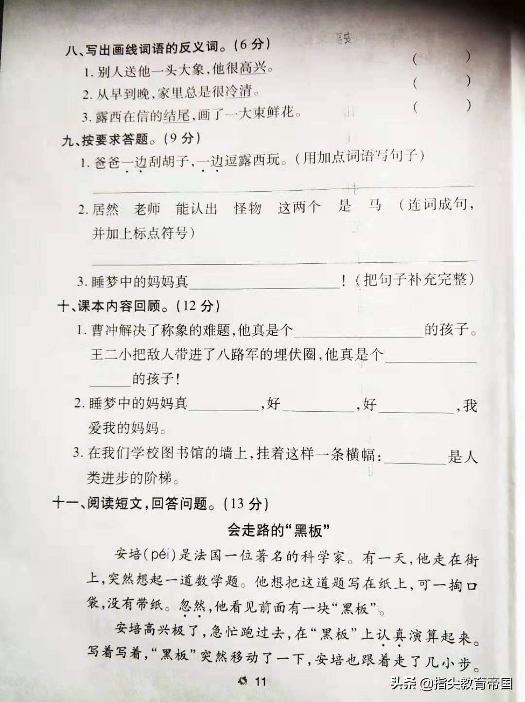 第七词,选词填空,第八题 写出反义词,第九题,造句子,补充句子类题,虽然三道题难度不大,但靠的是平时的多读多记,特别是反义词在二年级大量出现,孩子平时的积累很重要。