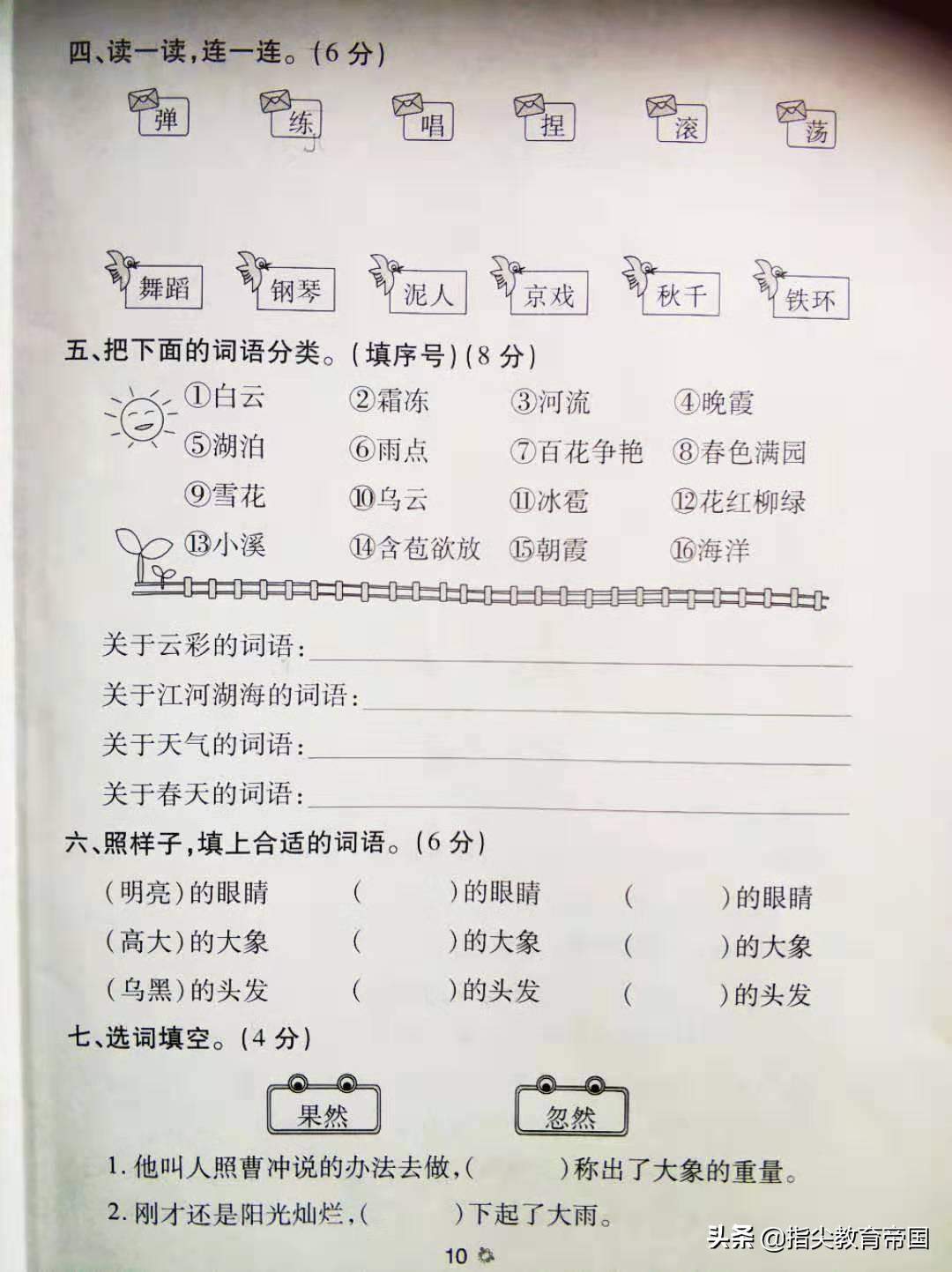第四题和第五题是语文园地三的重点内容,以连线和词语分类的方式出现,题型较为简单。如果让仿写类似的词语或成语,那么难度就加大了,但也是常出的题型之一。