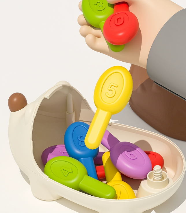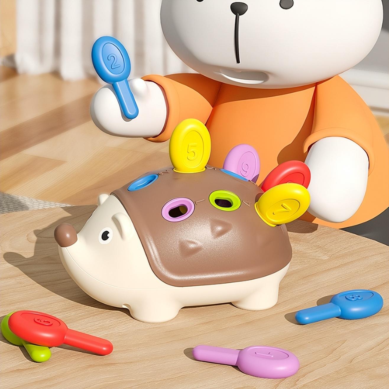 这是个小刺猬造型的玩具,身上的彩色“刺”做成了奶酪棒的样子,是可以摘下来的,上面还有数字,对应了几种鲜艳的颜色,本意是让小朋友认识颜色和数字还有锻炼动手能力。