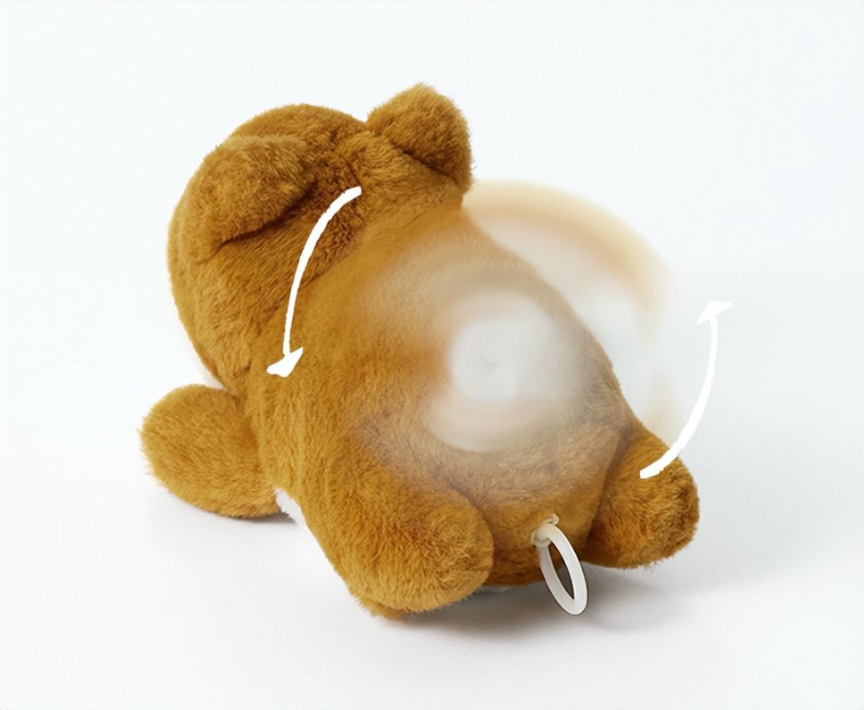 这个毛绒玩具是那种很经典的会摇尾巴的设计,有柴犬、鲸鱼和恐龙三种,都不需要用电,后面的绳子一拉,就可以动啦,除了鲸鱼另外两个还可以打圈转动。