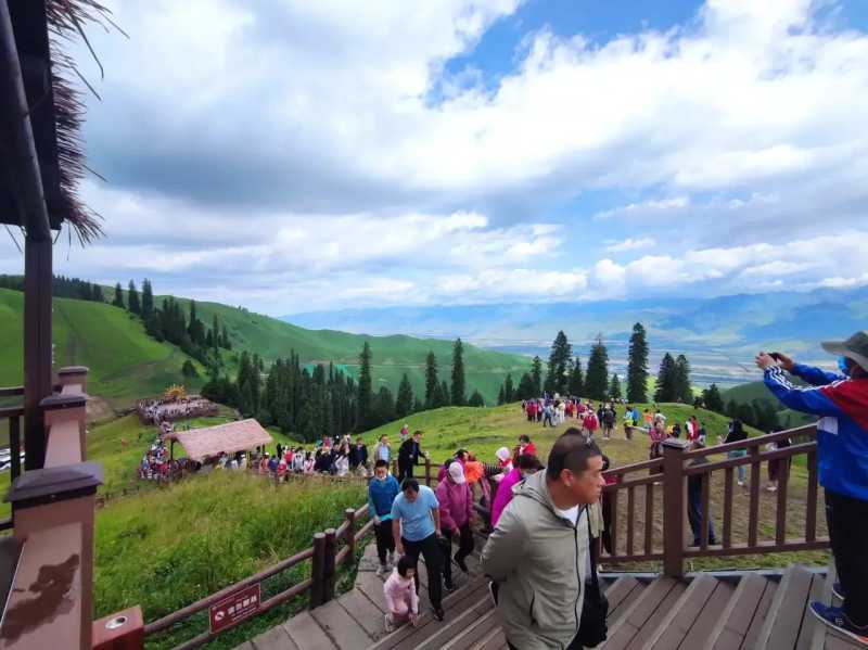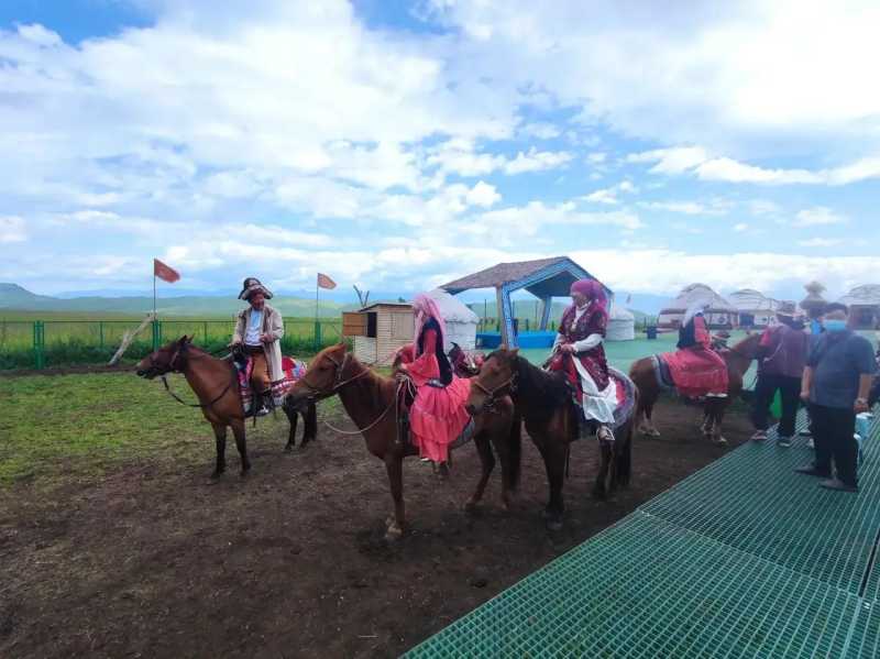 在这里优美的草原风光与当地哈萨克民俗风情结合在一起,很有民族特色。我们来时,景区正在表演哈萨克人婚礼情场剧,场面宏大,半个多小时的演出,把哈萨克人女儿出嫁,儿子娶媳妇的丰富过程,都表演得淋漓尽致,真的值得一看。每年六月份,哈萨克人就会在这里放牧,满山遍野牛羊成群,就是一幅“天苍苍,野茫茫,风吹草地现牛羊”的美丽的场景。