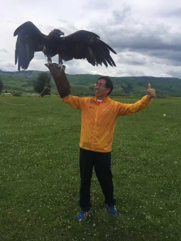 原来托起雄鹰拍照不仅有技巧的,还要有点胆量与力量的。在哈萨克小伙子的指导下,我慢慢的举着鹰,我当时是第一个去举起雄鹰的,我想这雄鹰要是啄一我,那一块肉就不见了。哈萨克小伙子先帮我戴上牛皮套再举起沉甸甸的雄鹰,但雄鹰却不展开双翅,我们必须让举着鹰的右手上下左右摆动,雄鹰怕掉下来,就欲展翅飞翔了。唉,这可真是个力气活。