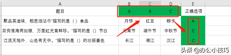 标题需要是A、B、C,而不是选项A、选项B、选项C,输入公式并下拉后,正确的答案就单独在一列中显示出来了。