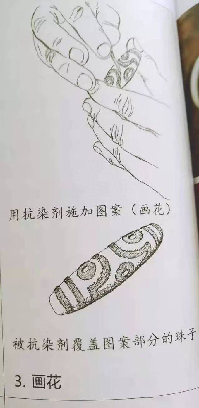 第三步,画花。至纯天珠所使用的是“抗染”的办法,也就是用抗染剂在已经白化的珠体上画上所需要的图案。抗染剂画出来的部分,将会是天珠成品上呈现白色图案的部分;相反,没有涂抗染剂的部分就是黑色的部分了。