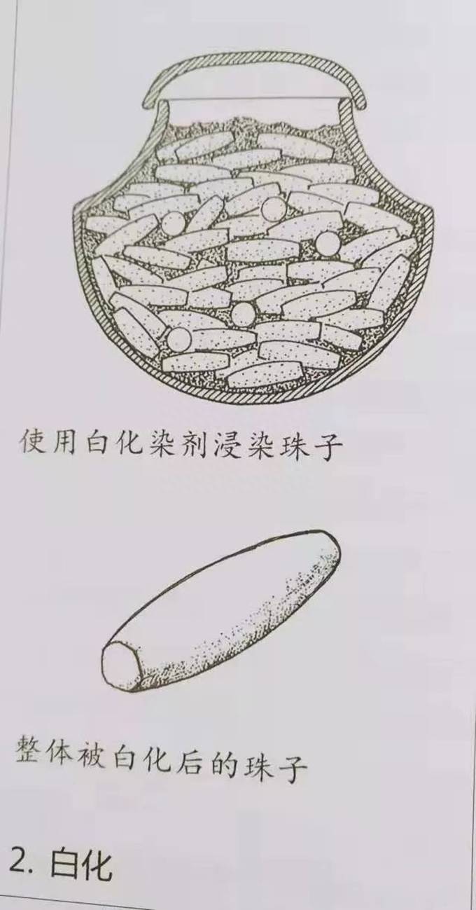 第二步,白化。天珠最麻烦的地方在于,如何将它的表面染成黑白相间,而且还要保证这些染料不会轻易褪色和脱落。古人选择先将它全部染成白色,也就是将天珠初坯放入盛有白色染剂的染缸里彻底白化。