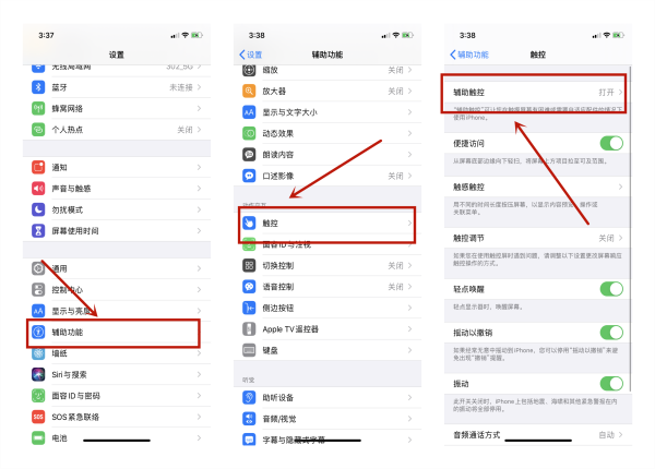 除了轻点屏幕截屏,iPhone也自带快捷键功能,轻点快捷键两下也能截屏,首先我们需要设置iPhone小圆点功能,打开设置功能,进入触控选项,然后设置顶层菜单栏,加入截屏功能,使用时点小圆点就能截屏。