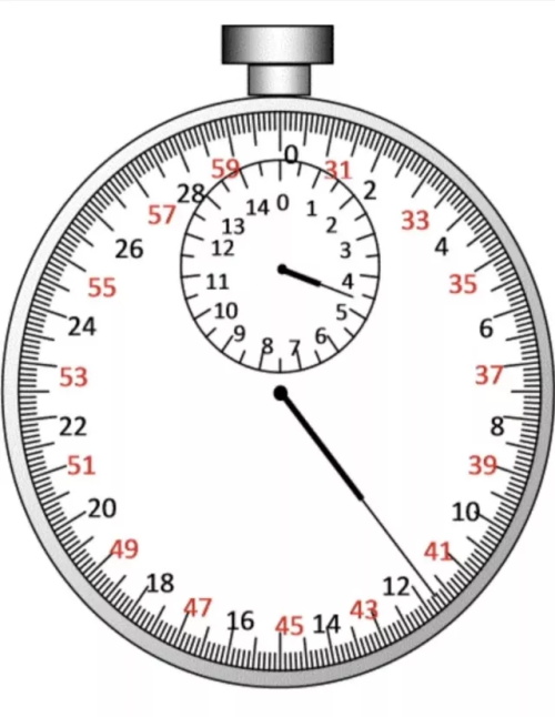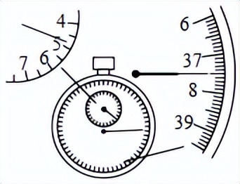 (3)如果小表盘指针指到后半分钟,则秒钟读数一定超过30s,再看大表盘示数,如果指针指到超过30s的地方,就直接读数;如果指针指到不足30s的地方,则用读数加上30s,为秒针实际读数。