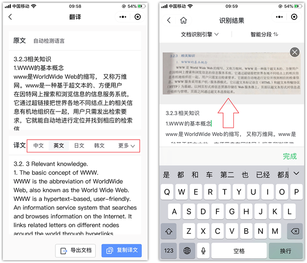 5、比如我点击翻译,它可以将识别出来的文本,翻译成10种语言;我点击对照原文,这是用来图文校对的,有错误地方便于及时修改。