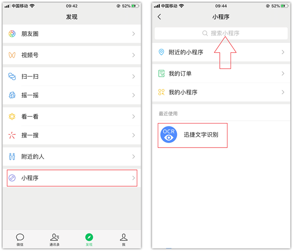 2、返回到微信首页,点击底部的【发现】按钮,这里将会出现小程序入口,进入后在上方的搜索框中查找“迅捷文字识别”这个工具。