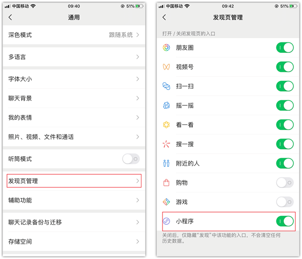 1、首先打开手机上的微信,点击右下角的【我】-【设置】-【通用】-【发现页管理】选项,点击进入后,选择开启【小程序】功能。