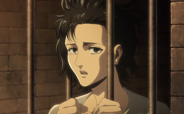 在三笠也艾伦违抗上级被关到牢房之后,三笠听到艾伦醒了的声音,立马探出头来问艾伦怎么了,说实话这是笔者看到过的三笠的形象中最狼狈的一次,话说作者也真是有够恶趣味的,非要将三笠女神的形象画成这样,明明在隔壁睡觉的艾伦斗殴没有炸毛。