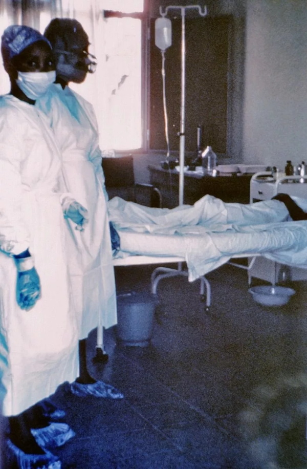 1976年的一张照片,当中有两名护士站在金沙萨第三个病人(Mayinga护士)前。Mayinga护士于扎伊尔金沙萨市的Ngaliema医院接受治疗,但于数天后死亡。/wiki