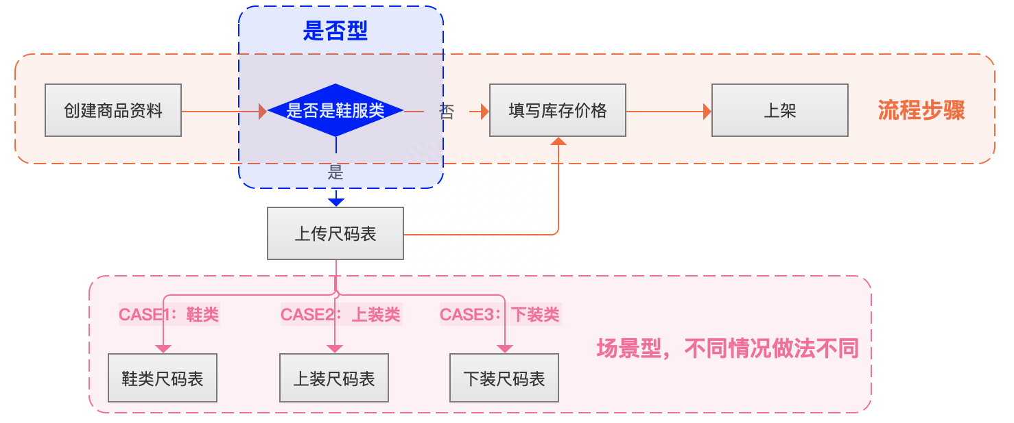 产品的系统绝大情况就是以上3种逻辑的排列组合。举个例子,比如创建商品时,鞋服类的需要额外上传尺码对应表,并且鞋、上装、下装要传不同的尺码表: