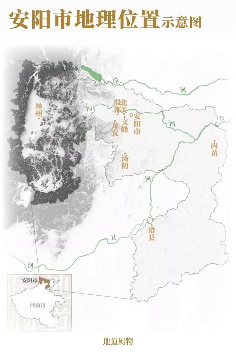 位于河南省最北部的安阳,接通豫、晋、冀三省。西隔高耸巍峨的太行山,与山西相望。自太行山蜿蜒而出的漳河,成为河南与河北之间的一道天然地理分割线。同样发源自太行山的洹河,是安阳的母亲河,为安阳冲积出肥沃、广袤的扇形平原。
