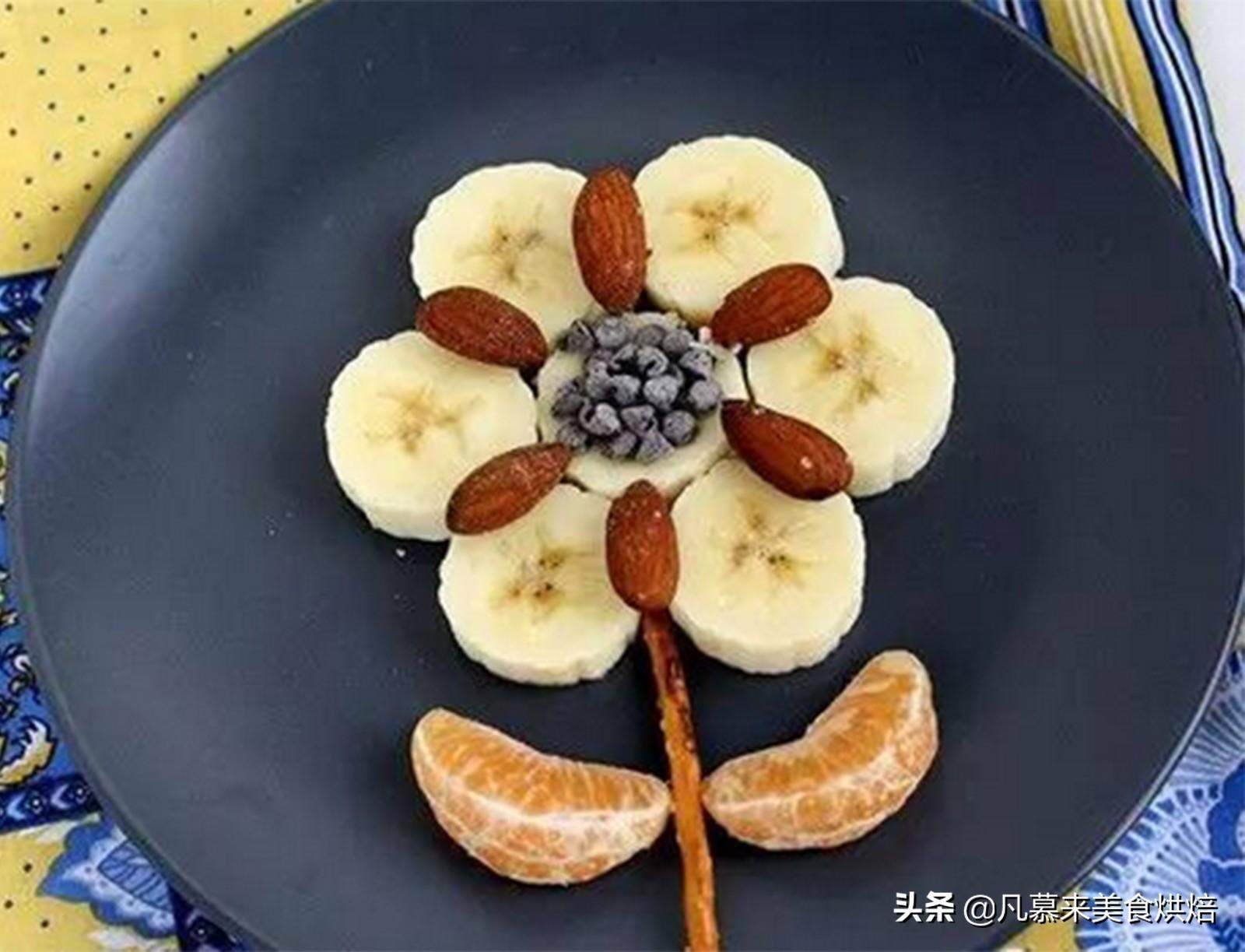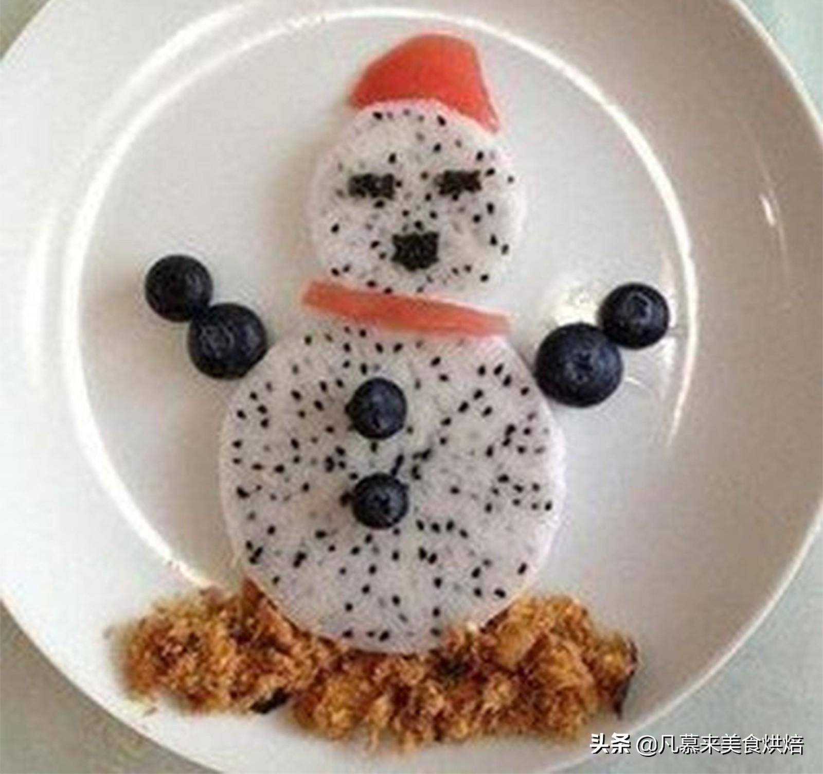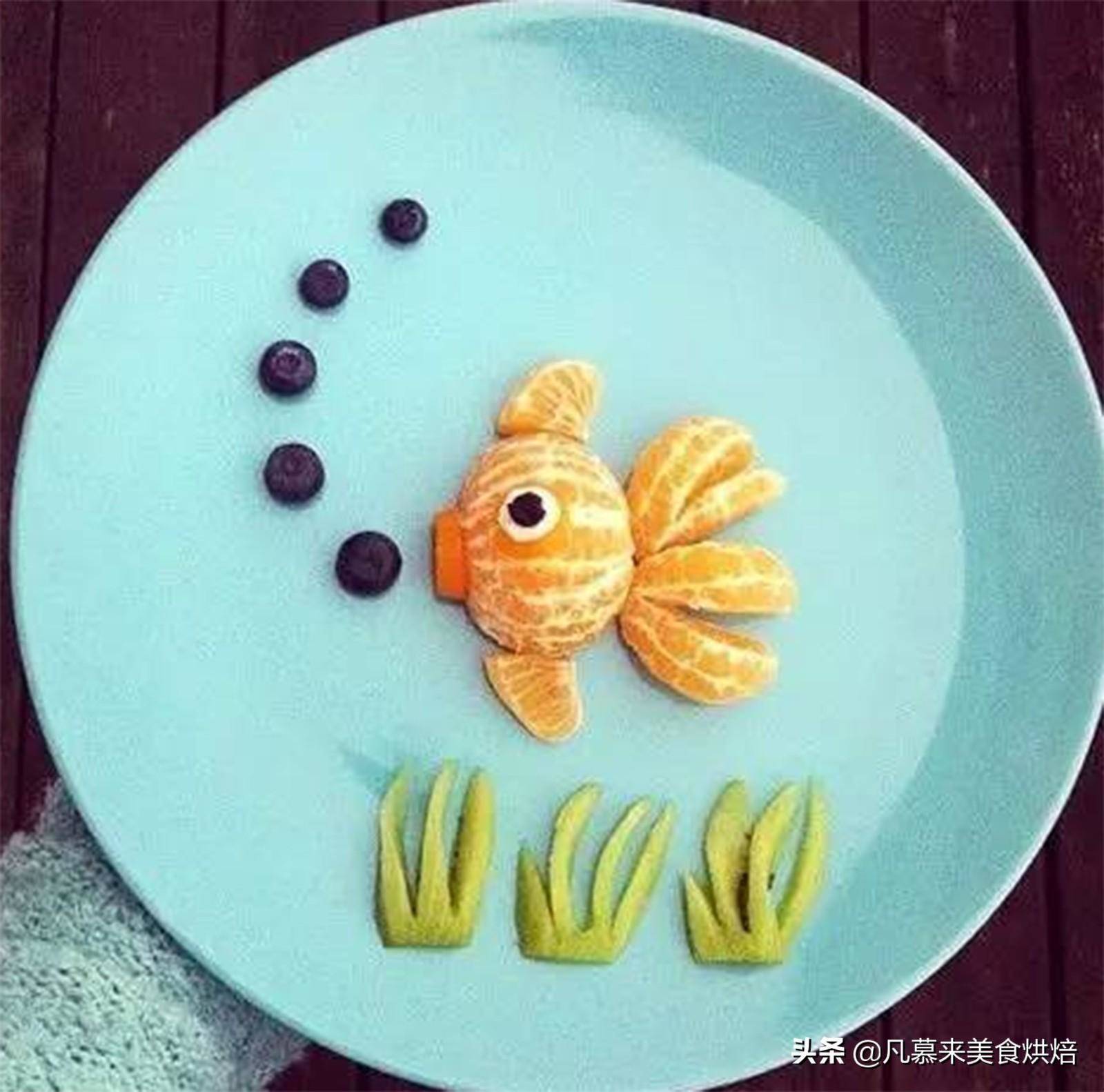11、鱼儿水里游:火龙果做的热带鱼,小葱当水草,蓝莓摆成一个个气泡,仿佛鱼儿水里游。