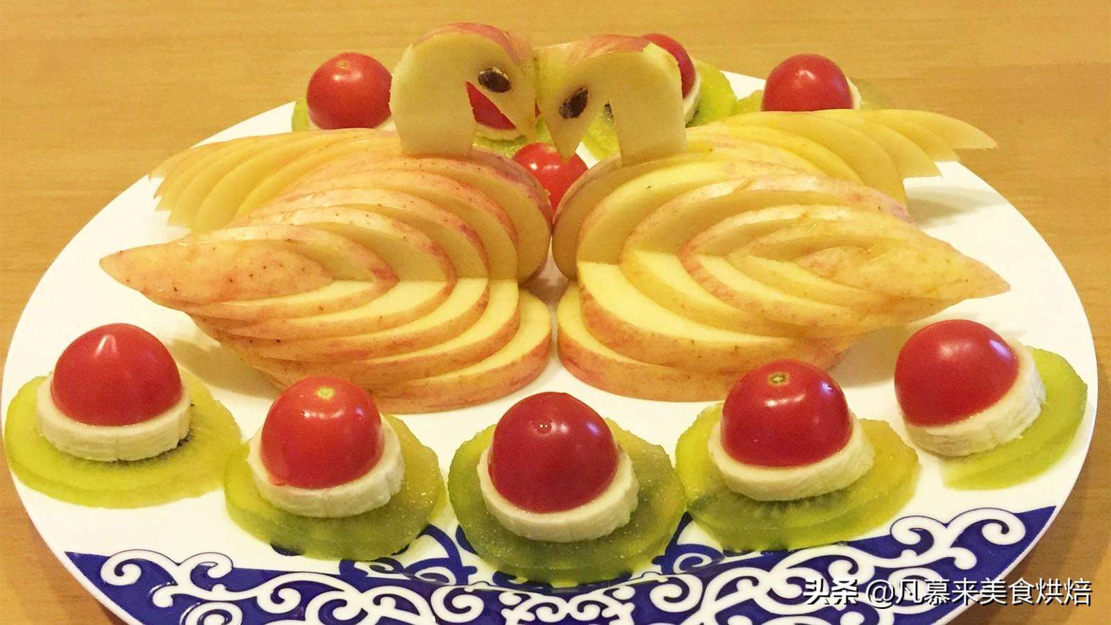 苹果在水果拼盘中,红色的外皮给作品增加了无限可能,一般切成片,依次排开,做成各种造型,如图。需要提示的是:苹果很容易氧化,切好后应泡在淡盐水中。