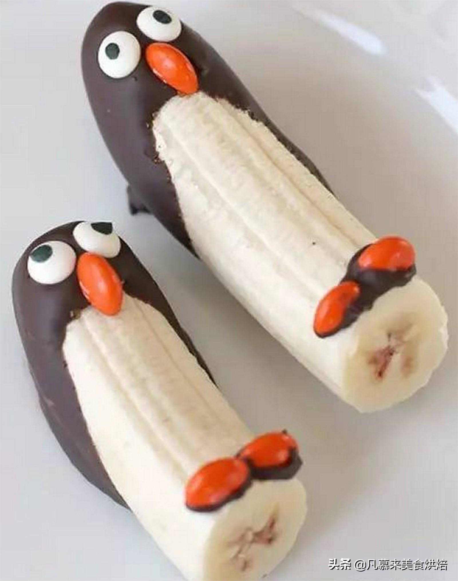 35、酷企鹅:香蕉蘸上巧克力,橘黄色糖果做成嘴,酷企鹅真可爱。
