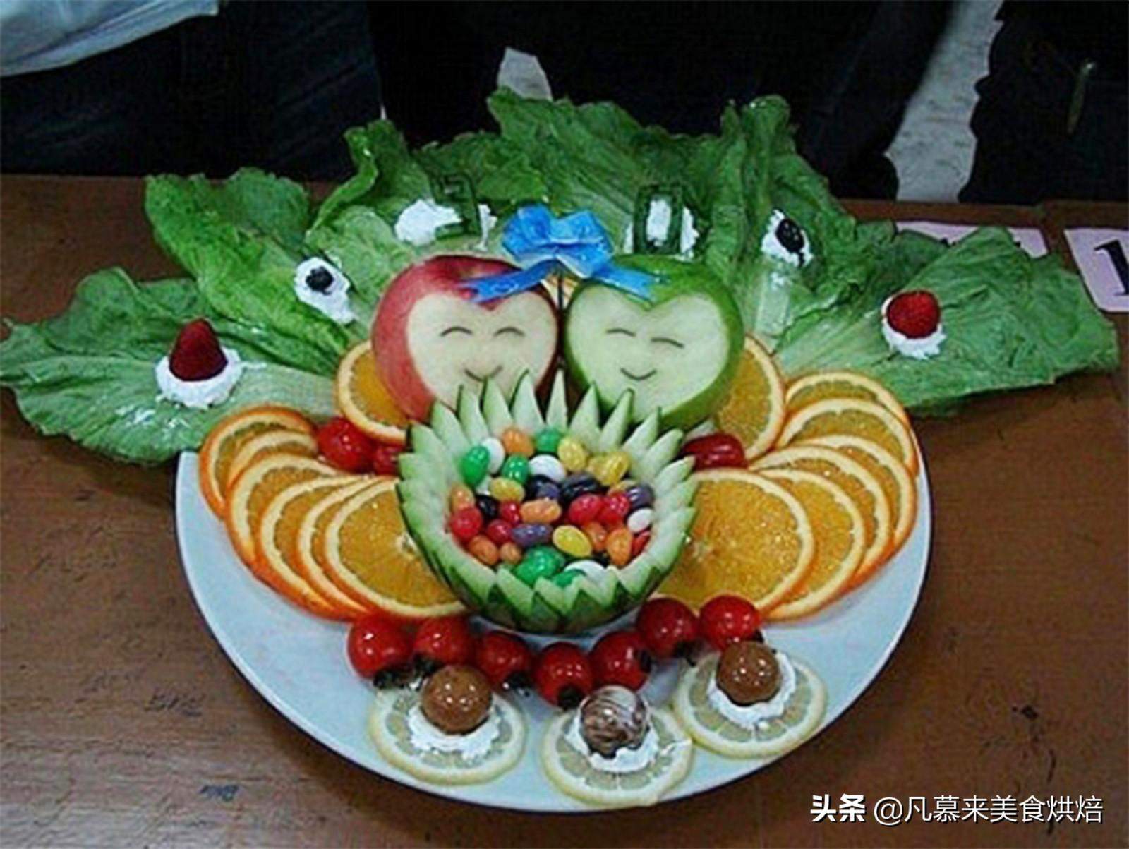 8、襁褓:西瓜皮掏空做婴儿的襁褓,橙子做婴儿的头,葡萄做婴儿的眼睛,各种水果铺满盘底和瓜皮中。