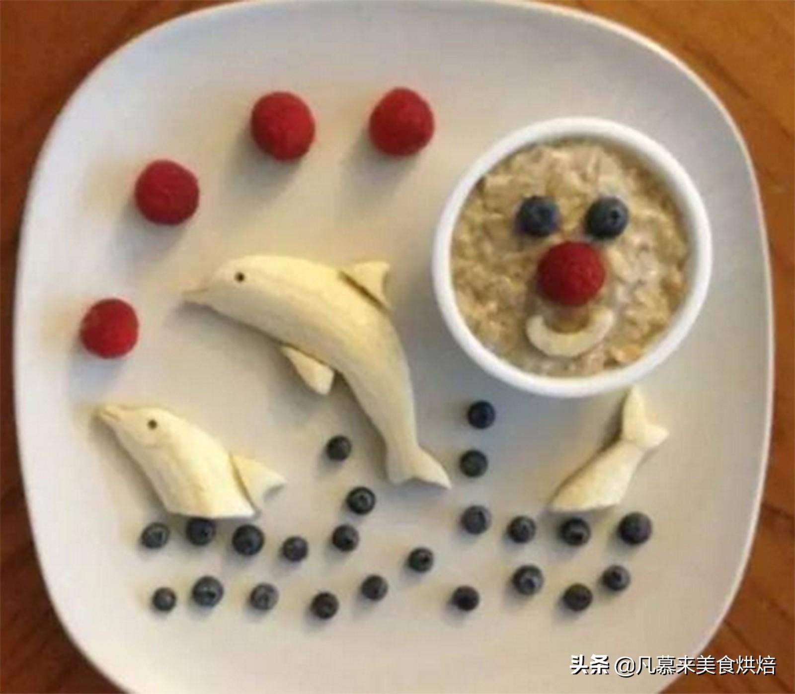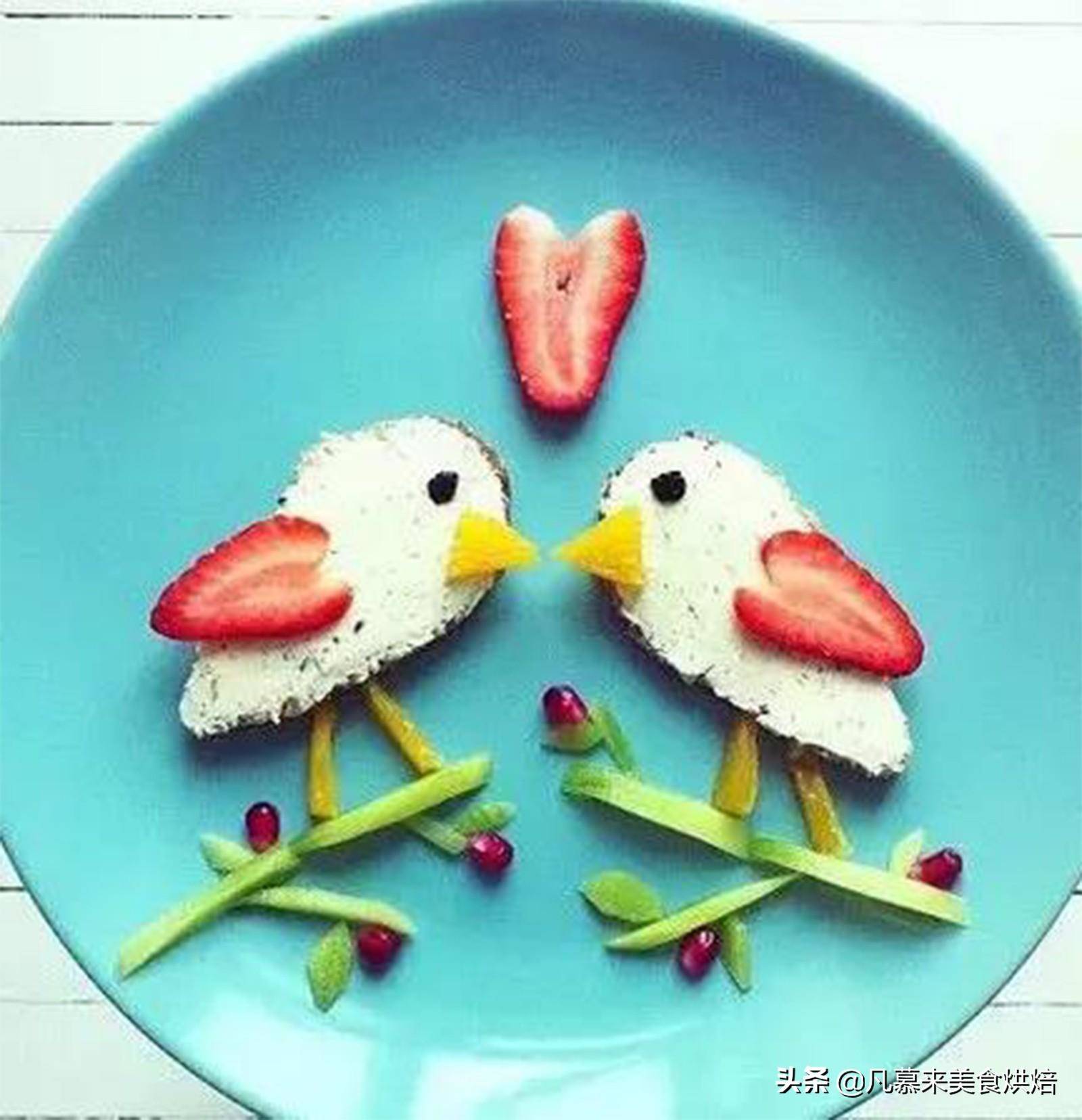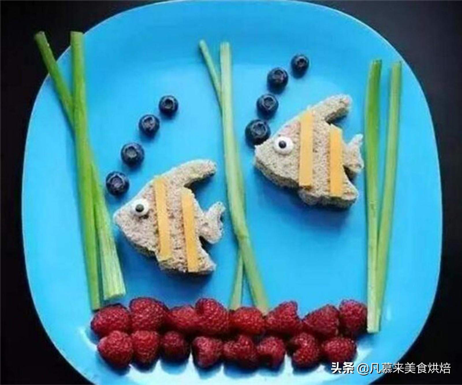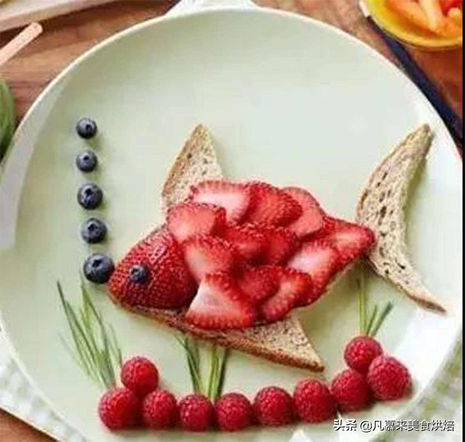 40、鱼儿:草莓做的鱼头、鱼鳞,蓝莓做的气泡,面包做的鱼尾、鱼鳍。