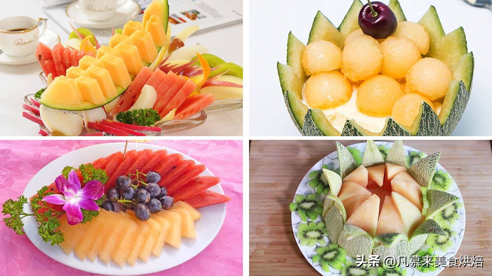 水果拼盘的花样切法:以西瓜、哈蜜瓜、芒果、苹果、火龙果为例。
