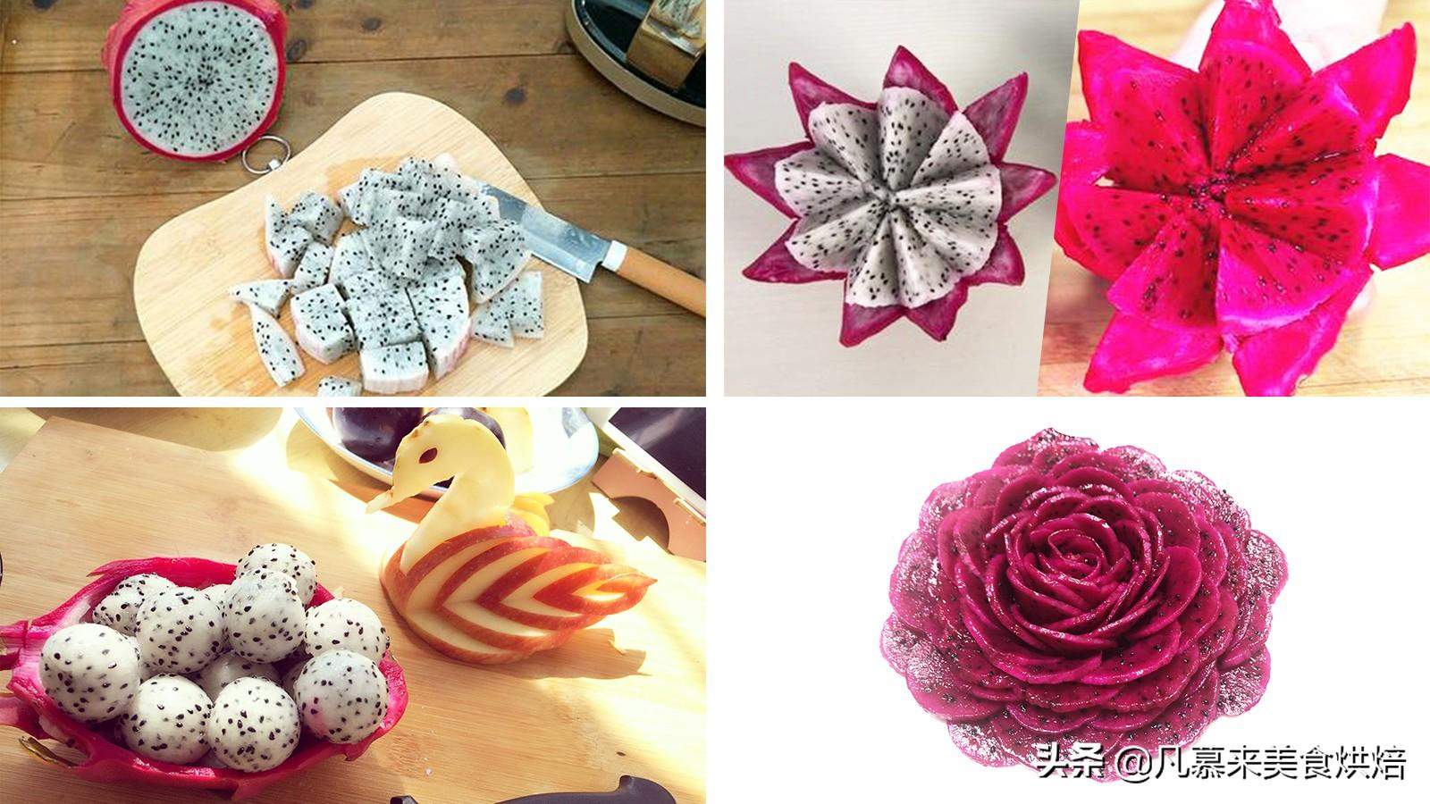 火龙果可以切成丁、切成锯齿状、挖成球、切成片摆成花朵造型等。