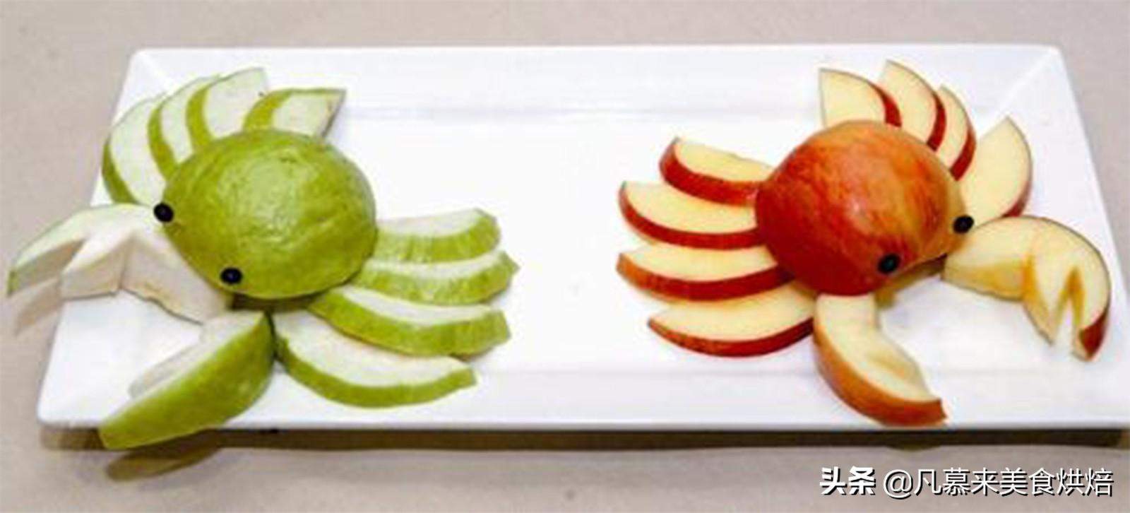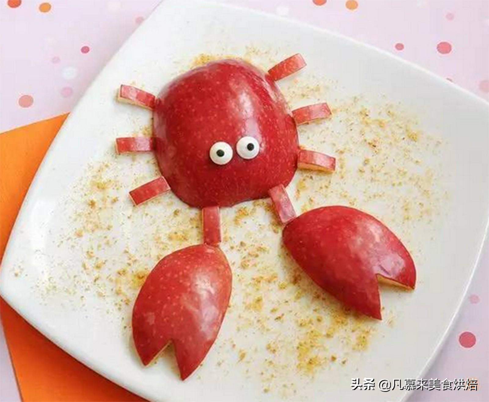 4、螃蟹:1个红色苹果,1个绿色苹果,切成片,做成螃蟹造型,2颗黑豆当做螃蟹的眼睛,2只栩栩如生的螃蟹就出现了。